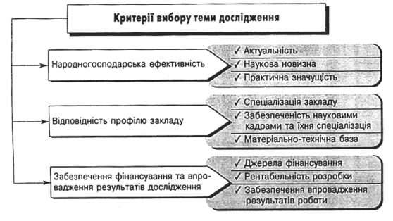 На організаційній стадії науково-дослідного процесу вибір проблеми обґрунтовується передусім її актуальністю, тобто наскільки її рішення сприятиме виконанню програм економічного та соціального розвитку держави, міста регіону. Проблема повинна бути чітко визначеною, послідовною і не суперечити економічним законам. Оскільки наукова проблема - це сукупність складних теоретичних або практичних питань, то в процесі наукового дослідження її поділяють на складові елементи - теми. Обгрунтування вибору теми дослідження проводять за такими критеріями (рис.4).