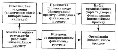 — організаційні форми (механізм) фінансування. Інвестування інноваційних процесів є ризикованою справою, однак у разі успіху віддача від інвестицій значно більша, ніж від поточної діяльності. Як правило, компанії прагнуть фінансувати ті проекти, які мають значний потенціал ефективності і забезпечать їм високі прибутки. Йдеться про інновації науково-технічної, організаційної, економічної, соціальної сфер. Економічні результати залежать передусім від характеристик самої інновації, однак велике значення для успішної реалізації інноваційного проекту мають умови залучення фінансових результатів, а отже, джерела фінансування.