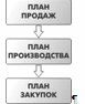 Конфигурация предусматривает планирование по следующим направлениям деятельности: продажи, производство, закупки (рисунок 1). Планы для отдельных направлений увязываются между собой. Составлять планы удобно в следующей последовательности: в первую очередь составляется план продаж, затем — план производства, в последнюю очередь — план закупок.