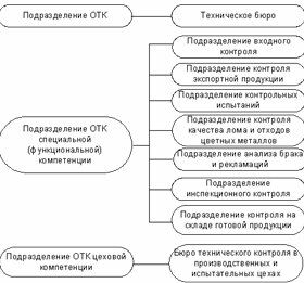 Необходимо подчеркнуть, что контроль качества, осуществляемый соответствующими подразделениями предприятий, является первичным (предшествующим во времени) по отношению к контролю со стороны других субъектов управления качеством. Это обстоятельство свидетельствует о необходимости первоочередного совершенствования деятельности служб технического контроля на предприятиях. На рисунке 4 показан типовой состав структурных подразделений отдела технического контроля (ОТК) крупного предприятия.