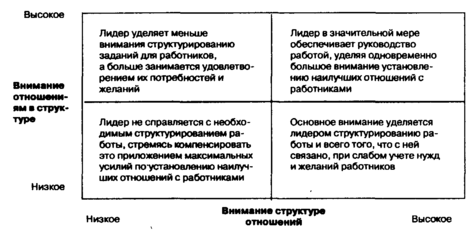 Исследования Университета штата Огайо считаются наиболее значительными среди тех, которые были предприняты в послевоенный период в области лидерского поведения. Их целью была разработка двухфакторной теории руководства. За основу были взяты две переменные: структура отношений и отношения в рамках этой структуры. К первой переменной относятся образцы поведения, с помощью которых лидер организует и определяет структуру отношений в группе: определение ролей, установление коммуникационных потоков, правил и процедур работы, ожидаемых результатов. Вторая переменная включает образцы поведения, отражающие уровень или качество отношений между лидером и последователями: дружественность, взаимное доверие и уважение, симпатия и гармония, чувствительность друг к другу, желание сделать друг другу доброе.7