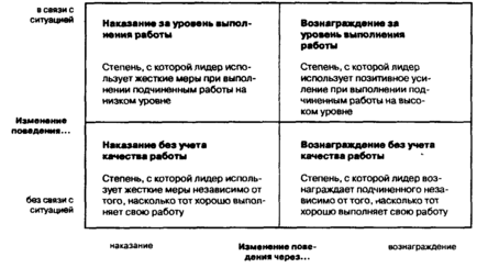 Концепция «вознаграждения и наказания» лидерского поведения основана на положениях теории о закреплении поведения. В данной концепции лидер рассматривается в качестве человека, управляющего процессом изменения поведения подчиненных в желательном направлении. Концепция выделяет четыре типа лидерского поведения в зависимости от применения вознаграждения или наказания (рис.4).