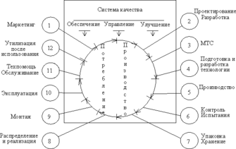 Петли качества - это замкнутый в виде кольца жизненный цикл продукции, включающий следующие основные этапы: маркетинг; проектирование и разработку технических требований, разработку продукции; материально-техническое снабжение; подготовку производства и разработку технологии и производственных процессов; производство; контроль, испытания и обследования; упаковку и хранение; реализацию и распределение продукцию; монтаж; эксплуатацию; техническую помощь и обслуживание; утилизация. Рисунок 2.