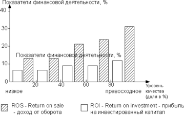 На рисунке 5 показаны уровни полученных доходов от сбыта (ROS, Return on Sale – доход от оборота) и прибыль на инвестиции (ROI, Return on Investment – прибыль на инвестированный капитал). Эти показатели выше у производителей продукции более высокого качества.