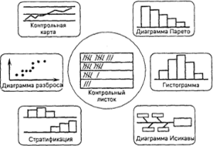 К основным методам или инструментам контроля качества относятся статистические методы, рисунок 9: контрольный листок; гистограмма; диаграмма разброса; диаграмма Парето; стратификация (расслоение); диаграмма Исикавы (причинно-следственная диаграмма); контрольная карта. Все элементы образуют комплексный подход и являются наиболее важной составляющей TQM.