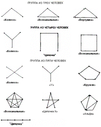 Существуют устоявшиеся образцы коммуникационных сетей для групп одной и той же или разной численности (рис.6). В сетях типа "кружок" члены группы могут коммуницировать только с теми, кто расположен рядом с ними. В сетях типа "колесо" представлена формальная, централизованная иерархия власти, при которой подчиненные коммуницируют друг с другом через своего начальника. Объективной основой такой ситуации является то, что лицо, находящееся ъ центре "колеса", имеет больше коммуникационных связей, чем другие члены группы. Он получает больше посланий, чаще признается другими членами группы как лицо, выполняющее лидерские функции, больше оказывает социального влияния на других членов группы, обычно несет большую ответственность за передачу информации, от него больше, чем от других, ожидается окончательное решение проблемы.