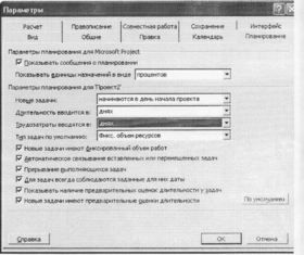 4. В меню Сервис выбрать команду Параметры и на вкладке Планирование в поле Трудозатраты вводятся в... указать, что объем работ должен вводиться в человеко-днях, а не в человеко-часах, как предлагает MS Project по умолчанию; для этого в списке следует выбрать пункт днях (см. рис. 1).