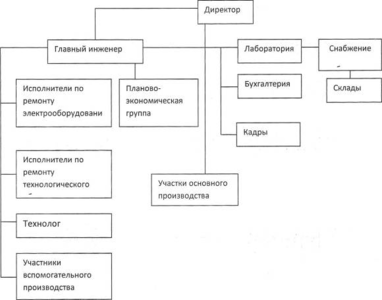 Во главе предприятия стоит директор. Он организует всю работу предприятия и несет полную ответственность за его производственно – хозяйственную деятельность. В основу управления положено трехступенчатая структура управления (директор – начальник цеха – мастер). На схеме видно, что руководство процессом производства осуществляется директором, а в руках главного инженера сосредотачивается функции работники и внедрение новой техники прогрессивной технологии. С цехами главный инженер осуществляет связь через подчиненные ему технические и технологические отделы.