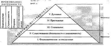Все потребности делятся на две группы – базисные и производные. Базисные потребности носят постоянный характер и имеют свою иерархию; производные – изменяются и не имеют иерархии.