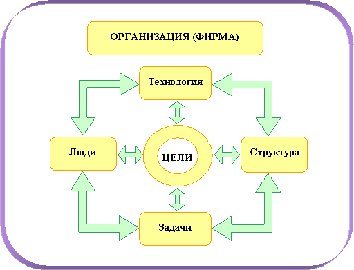 Организация имеет всегда хотя бы одну общую цель, достичь которую стремятся все члены трудового коллектива. На практике весьма редко встречаются организации, имеющие только одну цель. Организации, имеющие несколько взаимосвязанных целей, называют сложными организациями. Важно, чтобы намеченные трудовым коллективом цели были реальными и выполнимыми.2 Основными переменными внутренней среды организации являются: цели, задачи, структура, технология и люди.