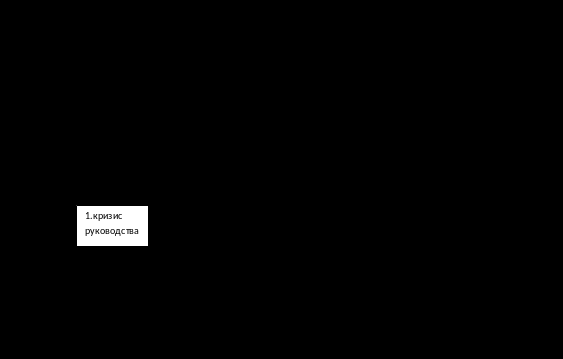 4.старение организации: главная цель — сохранение достигнутых результатов; эффект руководства достигается за счет координации действий, основная задача — обеспечить стабильность, свободный режим организации труда, участие и прибылях;