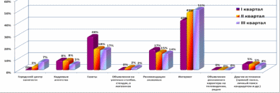 В течение трех кварталов 2010 г. в отдел рекрутинга обратилось 2038 соискателей. Среднее количество обратившихся в месяц составило 226 человек. Для привлечения персонала используются различные источники информирования, анализ которых представлен на рис.7.
