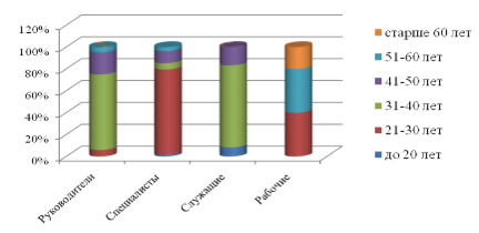 Рис.5. Распределение работников предприятия по категориям в зависимости от возраста, %