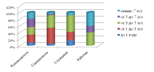 Рис.4. Распределение работников предприятия по категориям в зависимости от стажа работы, %