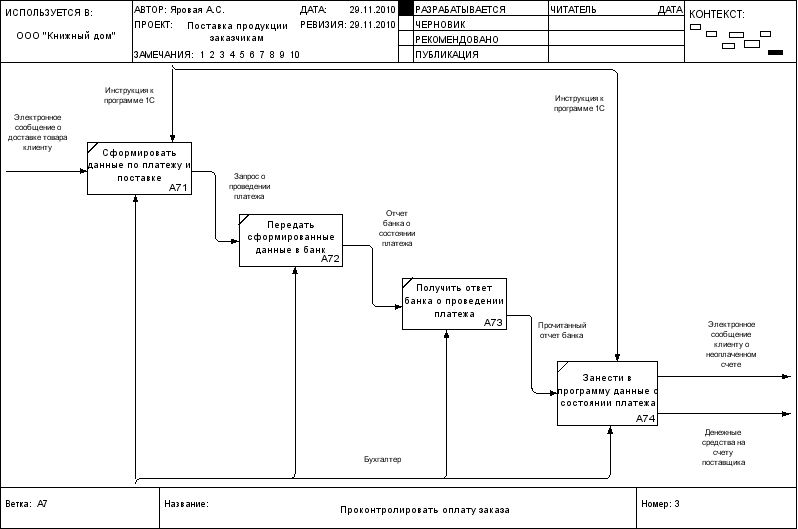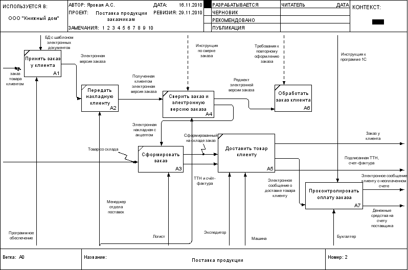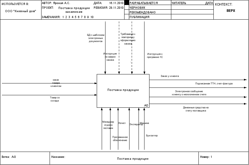 IDEF0-модель «как есть» разрабатывается в соответствии с требованиями стандарта IDEF0 согласно нормативно-методическим источникам. Состав модели: контекстная диаграмма (рис. 1), диаграмма нулевого уровня (рис.2), диаграмма первого уровня (рис.3). Бизнес-процесс поставки продукции содержит следующую последовательность действий: