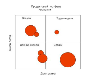 По каждому продукту устанавливается пересечение вертикальной и горизонтальной оси и рисуется круг, площадь которого соответствует доле продукта в объемах продаж компании (рис. 5)