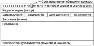 При ведении контроля за исполнением документов с помощью сроковой картотеки, то есть в ручном режиме, используются регистрационные карточки и картотечный ящик с 32 подвижными (картонными или пластмассовыми) разделителями. Тридцать один разделитель обозначают числа месяца, т.е. 31 день. В них расставляют регистрационно-контрольные карточки в соответствии со срокам исполнения, то есть каждую карточку кладут в разделитель с обозначением числа, на которое документ должен быть исполнен. За 32-й разделитель ставят карточки на документы, срок исполнения которых падает на следующий месяц. В последних числах месяца (за 2-3 дня) эти карточки будут расставлены по числам нового месяца. Перед первым разделителем помещают карточки с просроченным сроком исполнения. Они стоят здесь до тех пор, пока не будет указан новый, продленный срок исполнения. Таким образом, по сроковой картотеке легко можно узнать, что на какой день должно быть исполнено.