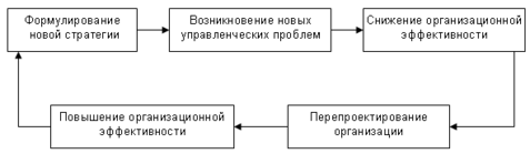 В 1962 г. А. Чандлер сформулировал принцип, согласно которому проектирование организации должно соответствовать стратегии, выбранной фирмой. Им был сделан вывод о том, что со сменой стратегии перед организацией возникают новые проблемы, решение которых непосредственно связано с проектированием новой организационной системы для фирмы. Отказ от перепроектирования организации приводит к тому, что фирма оказывается не в состоянии достичь принятых ею целей.