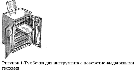 На рисунке 1 приложения В показана тумбочка к рабочему месту токаря, в которой ящики заменены более удобными поворотно-выдвижными полками. Имеются тумбочки, выполненные из оргстекла. Прозрачные стенки позволяют видеть содержимое тумбочки и быстро находить требующийся инструмент.