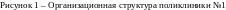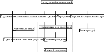 Организационная структура поликлиники №1, входящей в лечебный комплекс ММУЗ ГКБСМП №1, представлена на рисунке 1. Заведующий поликлиникой подчиняется непосредственно заместителю Главного врача по лечебной работе. В функции заведующего входит контроль деятельности отделений поликлиники, контроль качества оказываемой населению медицинской помощи, проведение лечебно-контрольных комиссий (ЛКК) по случаям выявленных врачебных ошибок и установления инвалидности. В функции лечебных отделений поликлиники, хирургического центра, стационара на дому и дневного стационара входит оказание населению качественной и квалифицированной медицинской помощи.