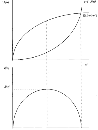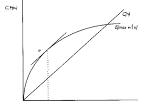 Во втором случае, основанном на концепции резервной заработной платы, индивидуум осуществляет последовательный поиск до тех пор, пока не встретит предложение по заработной плате, превышающее минимально приемлемую для него заработную плату, называемую резервной заработной платой wr. Таким образом, в этом случае задача поиска работы трансформируется в задачу определения такой резервной заработной платы, чтобы отдача от поиска R(w), т. е. разница между ожидаемой заработной платой E(w) и издержками с, была максимальной.