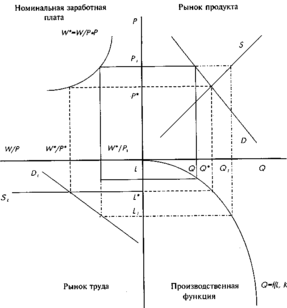 В состоянии конкурентного, классического равновесия все рынки сбалансированы, что показано линией, соединяющей точки Q*, Р*, L* и W*/P*. Такое состояние требует полной гибкости как цен, так и заработной платы.