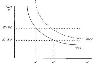 В итоге получаем уравнение, показывающее равенство предельных издержек поиска (левая часть уравнения) ожидаемой предельной отдаче (правая часть уравнения). Если ожидаемую предельную отдачу представить как убывающую функцию от резервной заработной платы A(wr), то и предельные издержки будут функцией от резервной заработной платы.