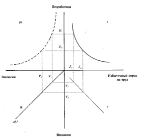 Соотношение между размерами безработицы и вакансиями, существующими в экономике, позволяет проанализировать структурную составляющую безработицы. Вывод кривой, отражающей зависимость между вакансиями и безработицей, основывается на зависимостях между избыточным спросом на труд Z = (DL SL)/SL, с одной стороны, безработицей U, вакансиями V — с другой.