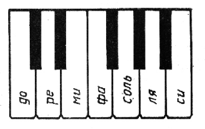 Семь ступеней, образующие октаву, называются до, ре, ми, фа, соль, ля, си. Весь звукоряд состоит из 7 полных и двух неполных октав: