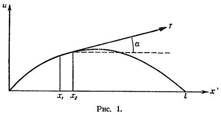 Будем предполагать, что смещения струны лежат в одной плоскости (x,u) и что вектор смещения u перпендикулярен в любой момент к оси x; тогда процесс колебания можно описать одной функцией u(x,t), характеризующей вертикальное перемещение струны. Будем рассматривать струну как гибкую упругую нить. Математической выражение понятия гибкости заключается в том, что напряжения, возникающие в струне, всегда направлены по касательной к ее мгновенному профилю (рис. 1). Это условие выражает собой то, что струне не сопротивляется изгибу.