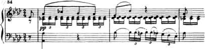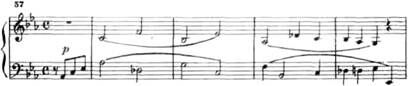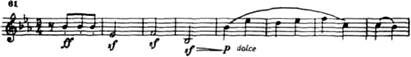 Вместе с тем эта тема полна тревоги, беспокойства. Достигнув вершины, главная партия внезапно обрывается на доминанте. Остановка подчеркнута знаком ферматы.