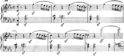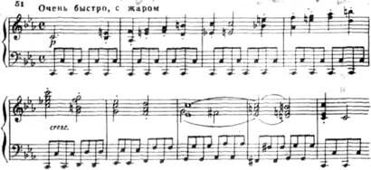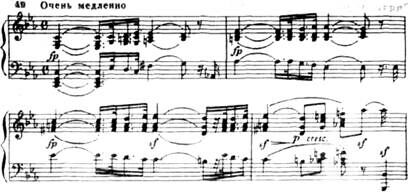 Кажется, что это две различные, резко контрастирующие между собою темы. Но если сравнить их мелодическое строение, то окажется, что они очень близки между собой, почти одинаковы. Как сжатая пружина, вступление затаило в себе огромную силу, которая требовала выхода, разрядки.