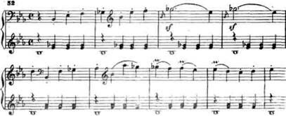 Однако широкий «разбег» побочной темы (почти на три октавы), «пульсирующее» сопровождение придают ей напряженный характер. Вопреки правилам, установившимся в сонатах венских классиков, побочная партия «Патетической сонаты» звучит не в параллельном мажоре (ми-бемоль мажор), а в одноименном к нему минорном ладу (ми-бемоль минор).
