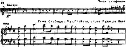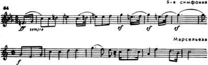 Пятая симфония Бетховена во многом отличается от симфоний Гайдна и Моцарта. Впервые Бетховен объединяет четырехчастный симфонический цикл единой мыслью, единым замыслом: «от тьмы к свету, через борьбу – к победе». Важное объединяющее значение имеет «тема судьбы» – ведущая тема, или лейтмотив, всей симфонии. Еще ярче, чем в «Патетической сонате», в пятой симфонии проявилась особенность музыки Бетховена – рождение контрастных тем из одной. Так, по существу, все темы первой части симфонии, а также основная тема скерцо возникают из той же «темы судьбы». Различны и в то же время глубоко родственны между собою темы второй части симфонии.