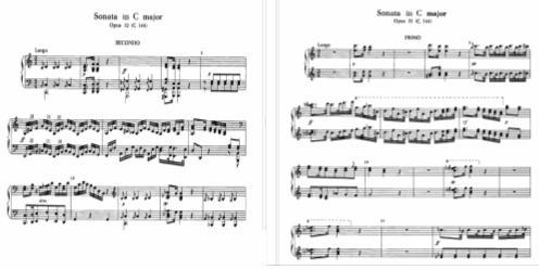 К примеру, соната для исполнения в четыре руки до мажор op.32 – является мастерским произведением и одной из лучших сонат композитора в этом жанре. Она является уникальной в использовании всей клавиатуры фортепиано и делает эффективным использование фортепианного созвучия.