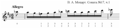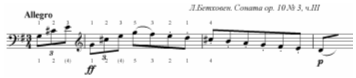В сонате №3 Бетховена арпеджио legato переходит на гребне динамической волны в нисходящий гаммаобразный пассаж staccato. Здесь 4-й палец на Ми отрицательно сказывается на звучании Фа-диеза, взятого 3-м пальцем в нисходящей гамме. Этот Фа-диез «проваливается» в общем движении низвергающихся звуков.