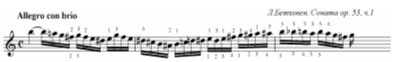 А вот в нижеследующем примере Бетховена в связующей партии «Авроры» верхняя аппликатура предпочтительнее (нижняя взята из редакции Лямонда), так как сочетание 1-го, 3-го, 5-го пальцев на мелодической вершине пассажа лучше, чем 3-го, 4-го, 5-го: