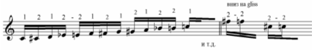 Для овладения glissando всеми пальцами в хроматической гамме Нейгауз предлагает такие упражнения: