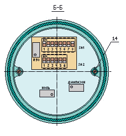 Элементы коммутации и потенциометры оперативной регулировки удобно и доступно расположены на платах 4 и 7 электронного блока (см. рис.), размещенных внутри специального корпуса 5. Корпус 5 закрыт крышками 3 и 8, уплотненными резиновыми кольцами, плата 7 с органами регулирования - дополнительной крышкой 6, которая крепится к плате винтами 14. Канал 10 служит для доступа к корректору "ноль тонко". В зависимости от назначения преобразователя блок имеет сальниковый кабельный вывод 11 (рисунок - основное исполнение), электрический разъем (для ОАЭ - спец. разъем) или специальный кабельный вывод 11 для вида взрывозащиты "взрывонепроницаемая оболочка".