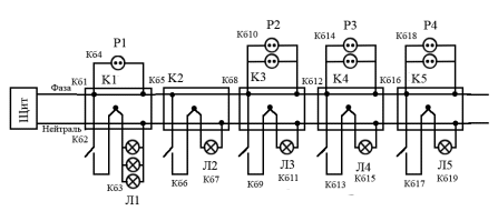 Р2, Р3, Р4 - Розетки у інформаційному відділі, кабінеті менеджера та у кімнаті спеціаліста з мат. частини відповідно. До них підключається комп'ютер з усім апаратним забезпеченням (2х300 Вт) та настільні лампи (3х80Вт)