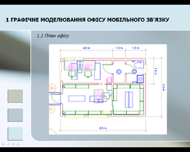 У графічному моделюванні був змодельований офіс, що працює у сфері мобільного зв’язку. План офісу розроблявся, виходячи з кількості співробітників і заданого устаткування (2 комп'ютери, 2 принтери, сканер, 2 блоки безперебійного живлення, музичний центр, сканер, телевізор). На плані показані меблі, комп’ютери, електротехнічні арматури (світильники, вимикачі, розетки), вікна й двері. Розроблений дизайн офісу (килимове покриття, кольори стін, форми вікон і т.д.). На території крім офісу, розміщені газони, доріжки, під’їзд для автомобіля. Був зроблений альтернативний вибір комп'ютерного забезпечення. План офісу займає 32,5 м².