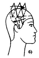 3. В конце соединяем среднюю часть верхней затылочной зоны с двумя боковыми частями. Для этого крайние пряди средней части отчесываем к волосам боковых зон и соединяем с ними (рис б).