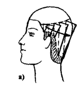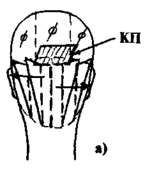 2. Далее, ориентируясь на длину КП, приемом «прядь за прядью» вертикальными проборами стрижем всю височную зону с уменьшением длины волос к уху (рис а).