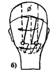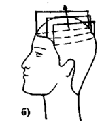 3. Каждую прядку стрижем в три захвата: сначала посередине, а потом с боков, сразу же соединяя волосы теменной зоны с височными (рис б).