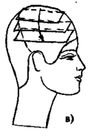 6. Так чередуя пряди, стрижем теменную зону, отделяя пряди косыми проборами (рис в).