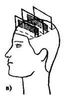 3. Так попрядно стрижем до середины теменной зоны, выделяя пряди вертикальными проборами и, отчесывая их на правый висок, соединяя с ранее подстриженными волосами (рис в).