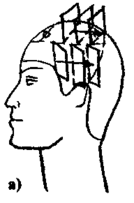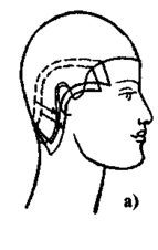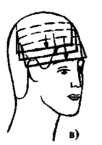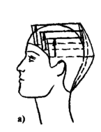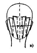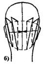 3. Так, приемом «наложение пряди на прядь» стрижем еще 3–4 пряди, отделяя их вокруг уха дугообразными проборами и оттягивая волосы затылочной зоны на лицо (рис а)