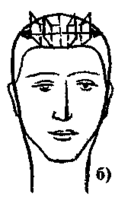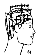7. Приемом «прядь за прядью» стрижем обе височные зоны, соединяя их с теменной и оформляя концы волос «зубчиками» (рис б).