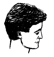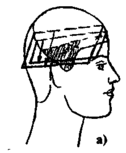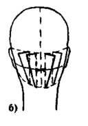 5. Все волосы височных зон и верхней затылочной зоны одним захватом отчесываем вниз и стрижем с внутренней стороны пальцев на уровне овального контура, проходящего вокруг головы, от уровня разреза глаз до затылка.