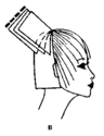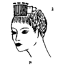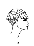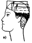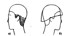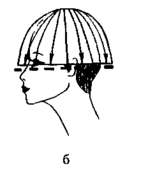 1. Одним захватом отчесываем волосы височных и верхней затылочной зон, захватываем их с внутренней стороны пальцев и стрижем на уровне нижних коротких волос по овальному контуру в направлении от виска к середине затылка, сначала с одной стороны, потом с другой. Таким образом намечаем верхний контур овальной «шапочки». Если волосы густые, то выполняем стрижку по контуру в два захвата (рис б).